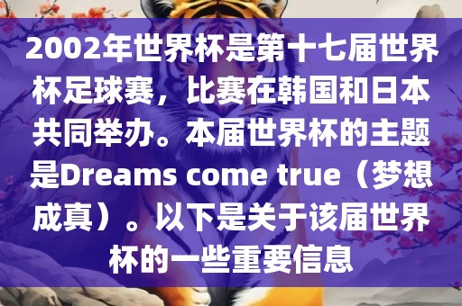 摘要:2002年世界杯足球赛是第十七届比赛,在韩国和日本共同举办,主题为Dreams come true。该届世界杯见证了众多精彩比赛和难忘的瞬间,同时也留下了许多重要信息,成为世界杯历史上的一个重要篇章。